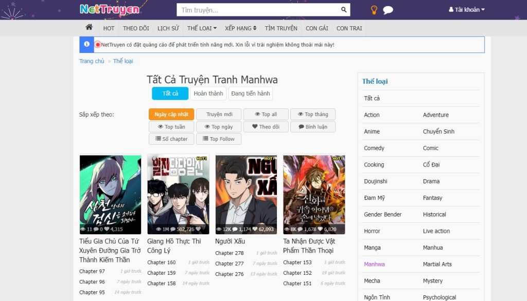 NetTruyen là lựa chọn hàng đầu cho những ai yêu thích truyện tranh Manhwa bởi kho truyện phong phú, cập nhật liên tục và chất lượng hình ảnh sắc nét. Tại đây, bạn có thể dễ dàng tìm thấy những bộ Manhwa hot nhất từ hành động, lãng mạn, đến giả tưởng, được dịch nhanh và chuẩn. Giao diện thân thiện, tốc độ tải mượt giúp trải nghiệm đọc không bị gián đoạn. Ngoài ra, cộng đồng độc giả sôi nổi của NetTruyen còn giúp bạn dễ dàng trao đổi, chia sẻ cảm nhận về từng tập truyện. Nếu bạn muốn theo dõi các siêu phẩm Manhwa mới nhất, NetTruyen chính là điểm đến không thể bỏ qua.